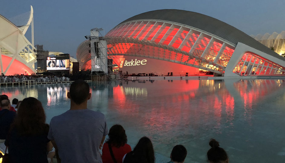 Die Absolventenklasse 2018 des Berklee-Campus graduierte am Montag, den 9. Juli. Zur Feier dieses wichtigen Ziels gaben Studenten aus allen vier Master-Absolventenklassen am Samstag, den 7. Juli auf dem Berklee-Campus in Valencia ein Sonderkonzert , das auf einer von RCB ausgestatteten schwimmenden Bühne gegenüber dem Hemisféric in Zusammenarbeit mit der futuristischen Stadt der Künste und Wissenschaften stattfand.