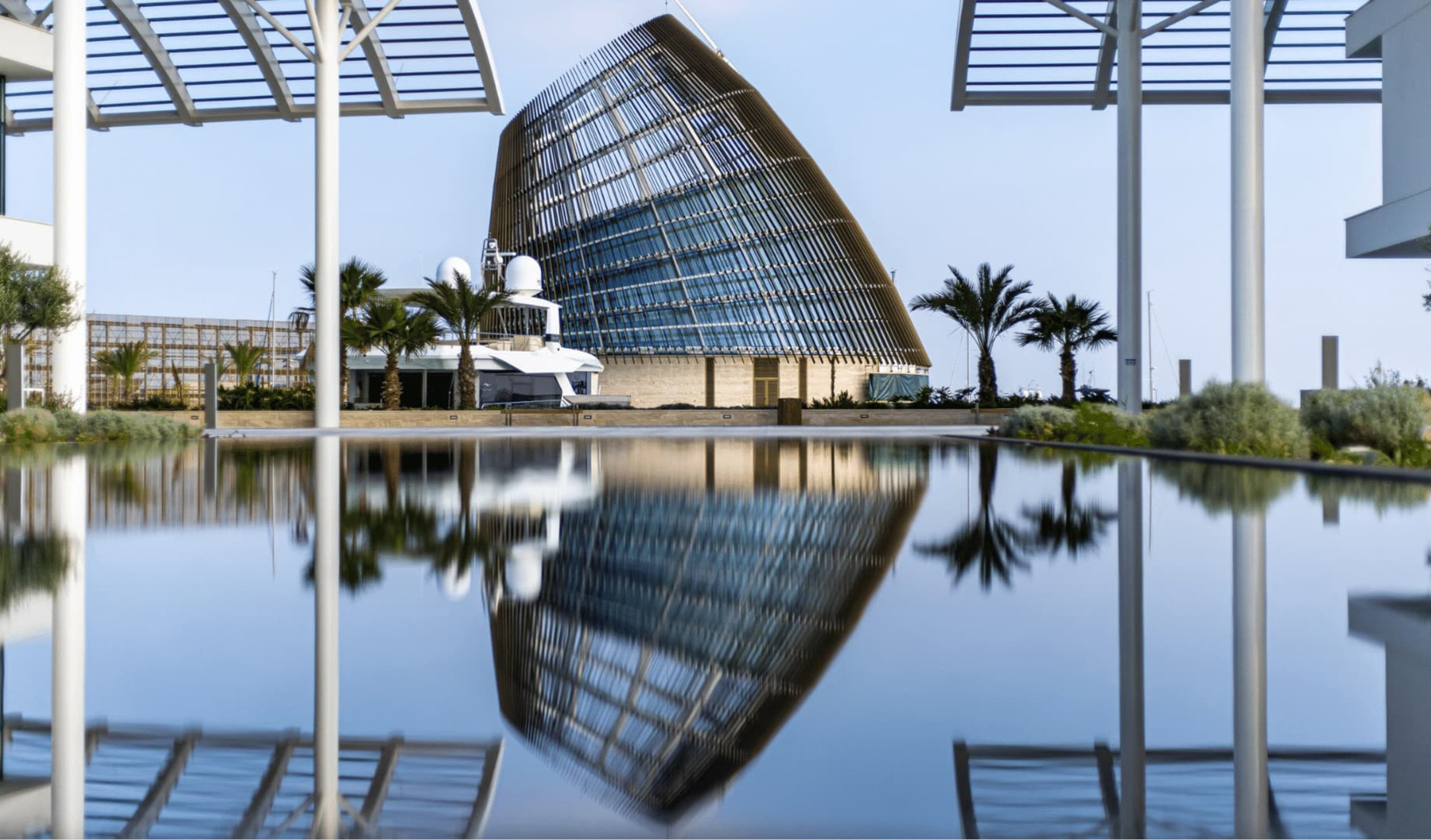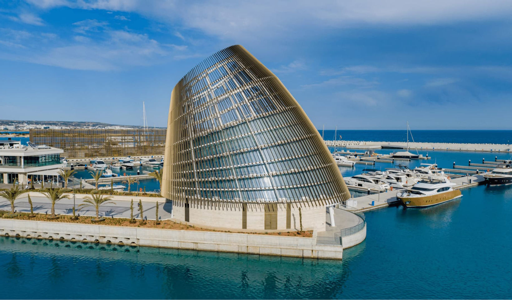 Ayia Napa Marina, Cyprus - Completely immersed in the marina environment, the Event Center stands as the main focal attraction of Ayia Napa Marina. Prominently located on the south-eastern end of the Commercial Area, this elliptical, conical glass building is a destination venue and a one-of-a-kind architectural marvel in Cyprus, designed for both open-air and indoor events. Its distinctive vertical sunshades create a layered, sculptural façade by day and transform the building into a glowing landmark by night.