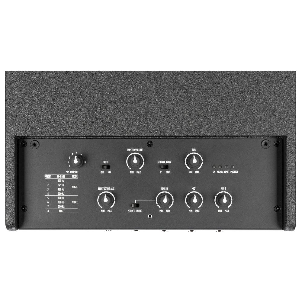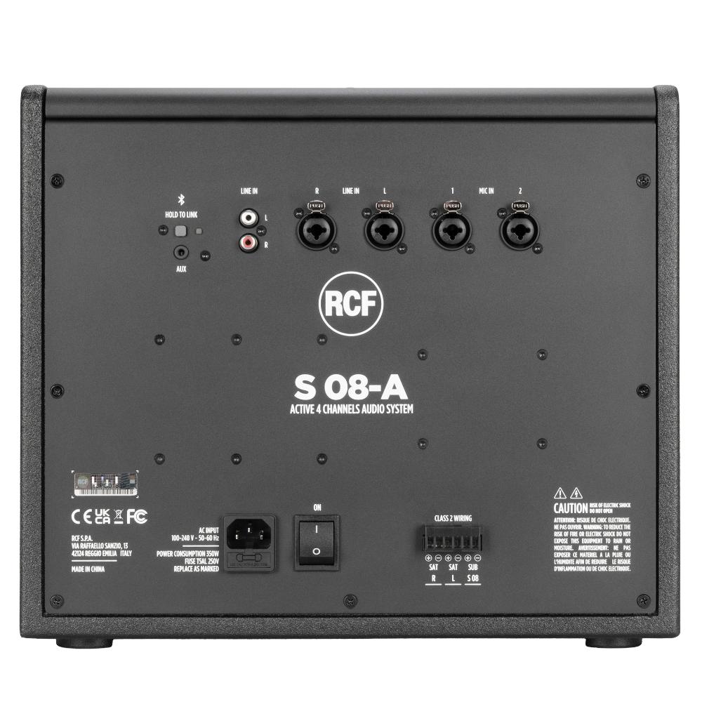 S 08-A is a self-powered audio system providing all those features required for a complete environment sonorization. It features a four channel class D amplifier able to power the integrated 8’’ woofer, 2 satellites lines for both mono and stereo applications, and an additional passive S 08 subwoofer. Line and mic inputs can be mixed in an optimized way balancing each single level. Bluetooth connectivity allows audio streaming from any mobile device, and comes alongside traditional RCA, combo XLR and 3.5mm jack connectors. S 08-A offers 8 different equalizations, optimized for music and voice reproduction. Specific HI-PASS filter values allow to combine the system with a wide range of RCF speaker models, ensuring high application flexibility.