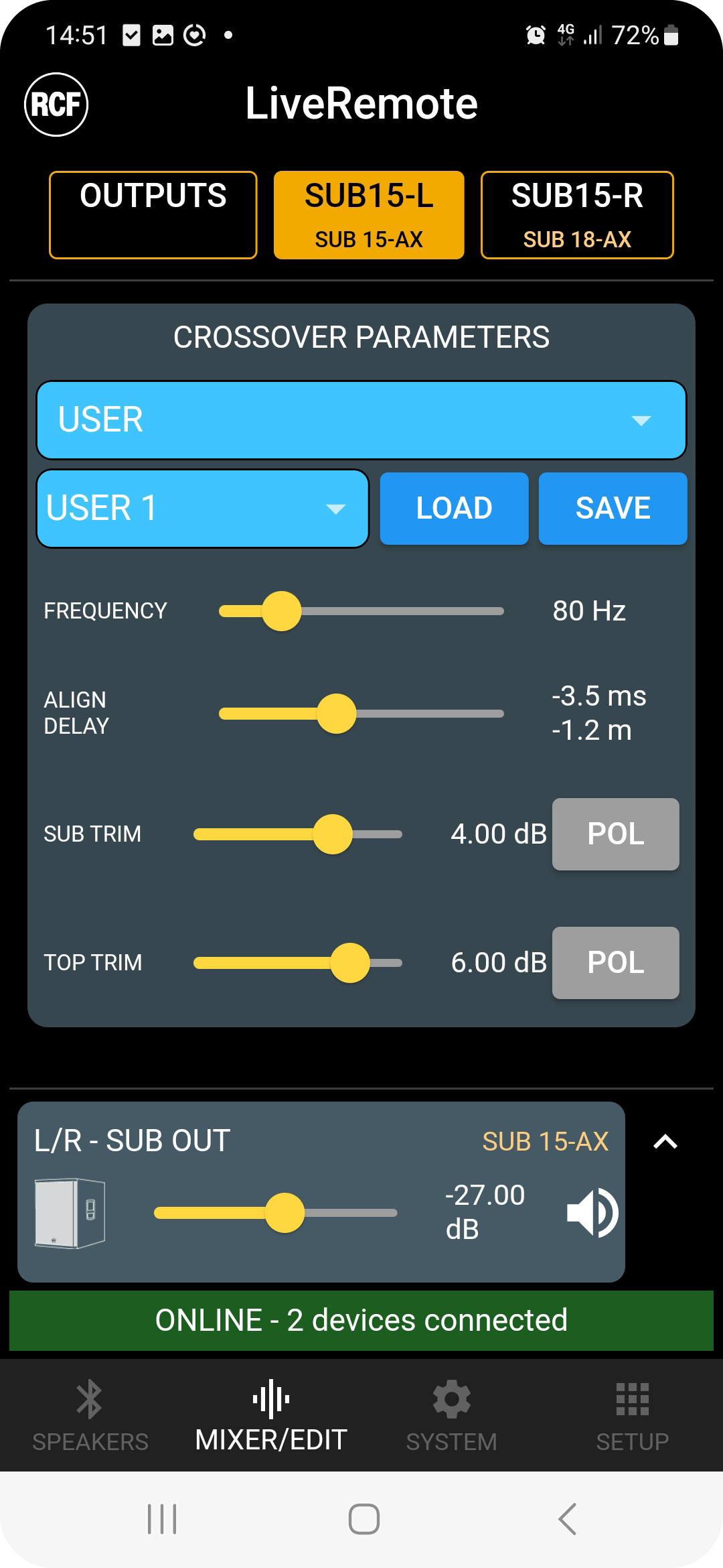 With the RCF LiveRemote app, you can control up to 8 AX devices via Bluetooth® simultaneously from your smartphone or tablet. The app makes it easy to adjust internal parameters and save and recall presets. You can also use the app to control your entire sound system, with a fully featured 8-band EQ and advanced functions.