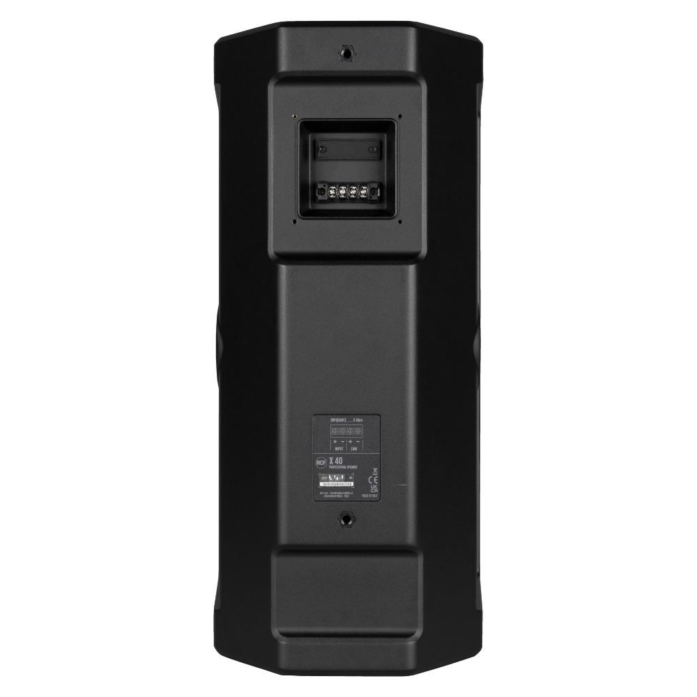 X 40 is a two-way professional speaker designed for a wide range of fixed indoor and outdoor installations requiring high audio quality and extreme durability. Thanks to the state of the art RCF transducers, two 10’’ high power woofers with 3.0’’ voice coils and one 1.4’’, titanium dome, compression driver with 4.0’’ voice coil, it offers exceptional max SPL level with a balanced and clear sound. The asymmetrical horn with 110° by 60° directivity allows an efficient coverage at different distances, as for example in the case of a racing circuit grandstand. The cabinet is made of high-density polyurethane, while the aluminum grille guarantees protection from dust and rain, thanks to a waterproof fabric layer. A bracket for wall mount vertical installation is included.