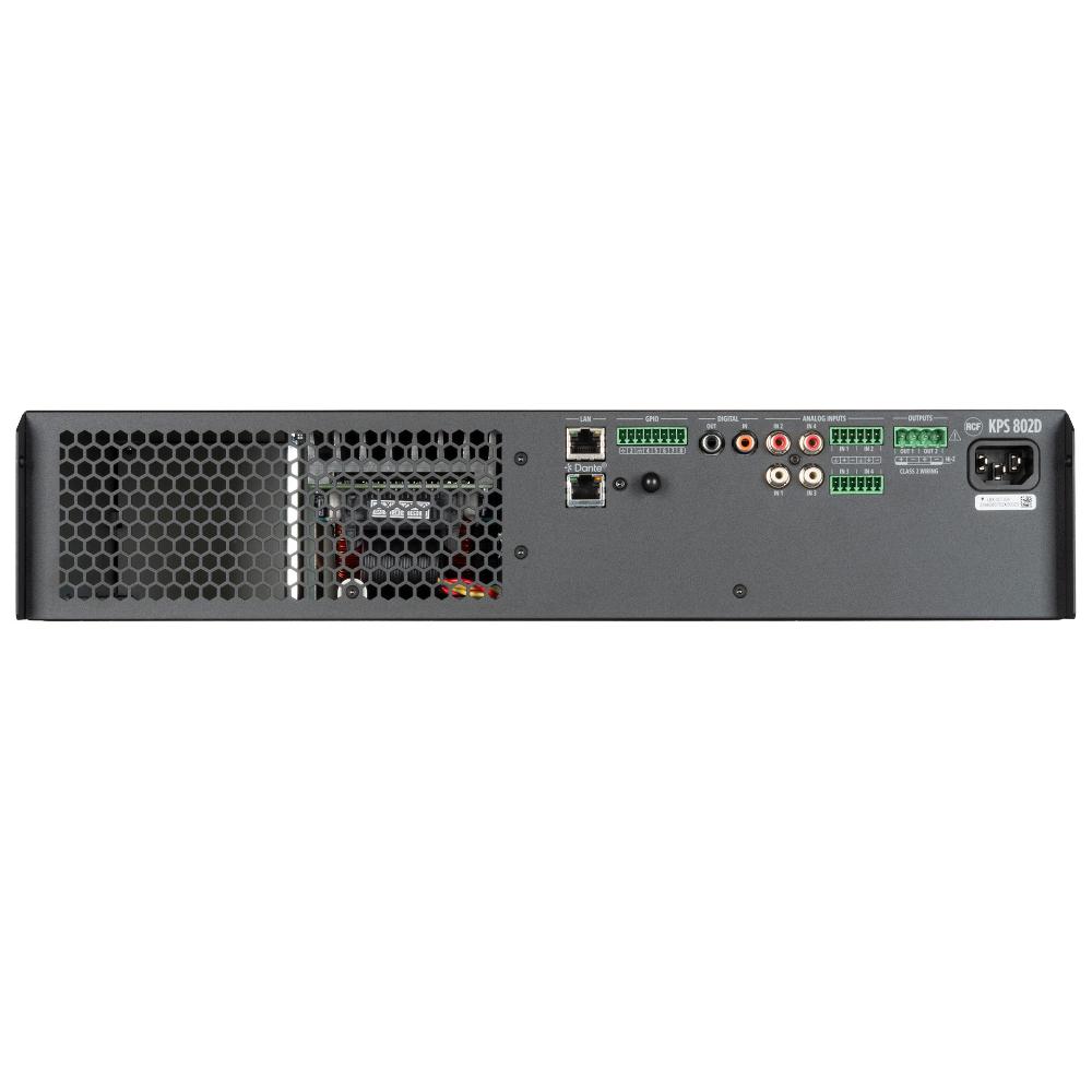KPS 802D is a professional 2-channel amplifier with a total output power of 1600 W, designed for high-demanding audio installations where flexibility, reliability, and advanced control are essential. Equipped with Class-D amplification and integrated DSP, it provides complete and accurate signal processing, with intuitive configuration through RCF's RDSpace software. The library of RCF loudspeakers’ presets simplifies the setup and ensures optimal performance. Native Ethernet connectivity makes it ideal for distributed systems with independent zone control, while the integrated wireless access point allows direct connection with mobile devices. Equipped with Audinate Dante™ AoIP networks interface, allowing the distribution of 4 digital audio channels.