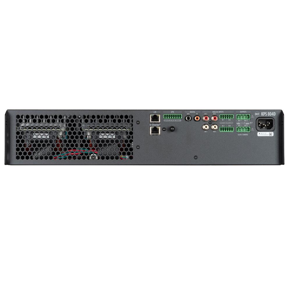 KPS 804D is a professional 4-channel amplifier with a total output power of 3200 W, designed for high-demanding audio installations where flexibility, reliability, and advanced control are essential. Equipped with Class-D amplification and integrated DSP, it provides complete and accurate signal processing, with intuitive configuration through RCF's RDSpace software. The library of RCF loudspeakers’ presets simplifies the setup and ensures optimal performance. Native Ethernet connectivity makes it ideal for distributed systems with independent zone control, while the integrated wireless access point allows direct connection with mobile devices. Equipped with Audinate Dante™ AoIP networks interface, allowing the distribution of 4 digital audio channels.