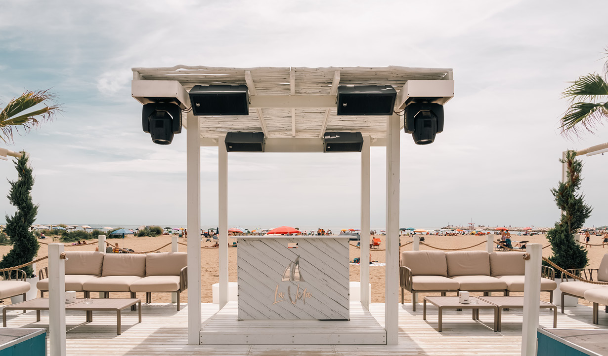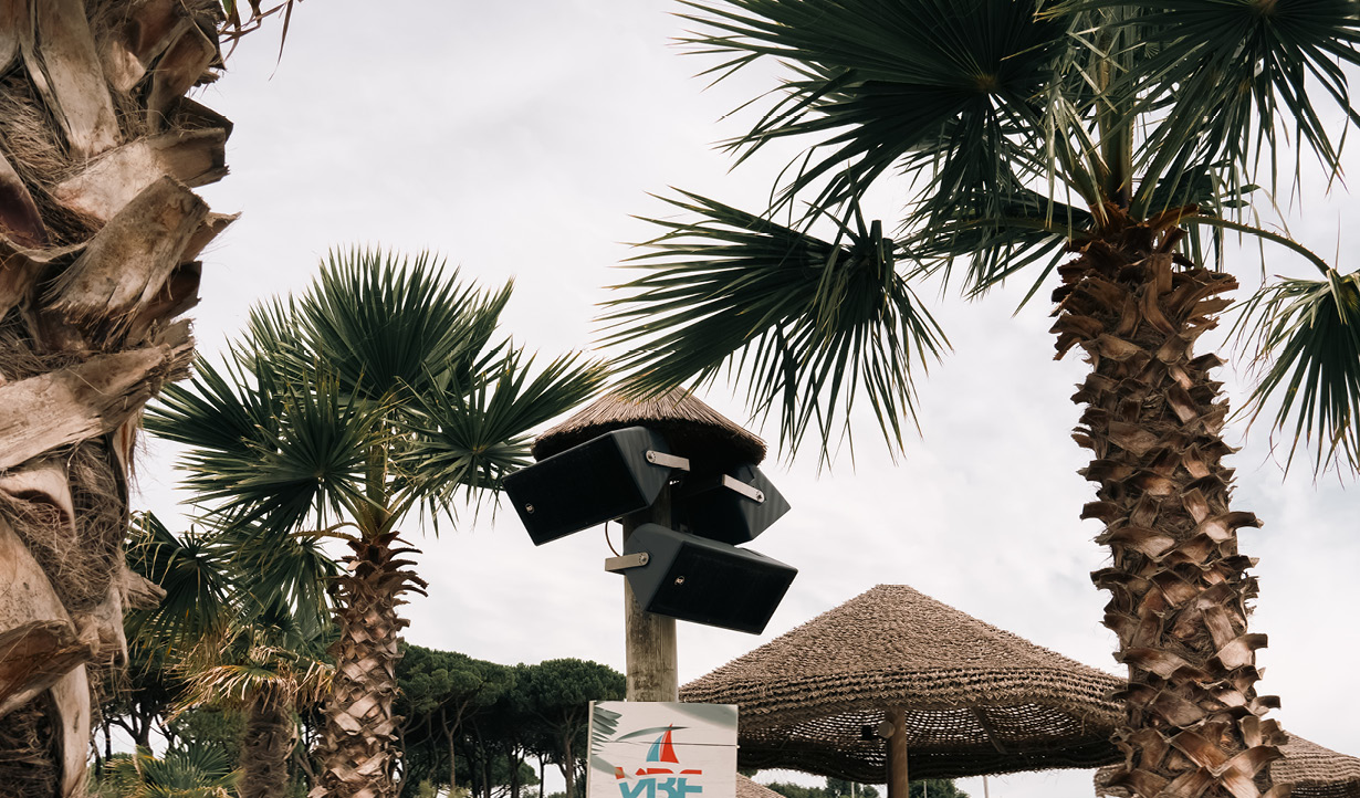 La Vela Sunrise ha rinnovato completamente il sistema audio residente per offrire un'esperienza di ascolto avvolgente e di qualità, sia all'interno del locale che nella vasta area esterna. Proprio per questo è stato installato un nuovissimo impianto RCF, in grado di coprire con un'ampia area del locale e della spiaggia con sistemi ad alta potenza e in grado di resistere alle intemperie, ai raggi UV, all’umidità estiva ma sopratutto alla salsedine marina, nemico numero uno dei trasduttori e delle elettroniche.