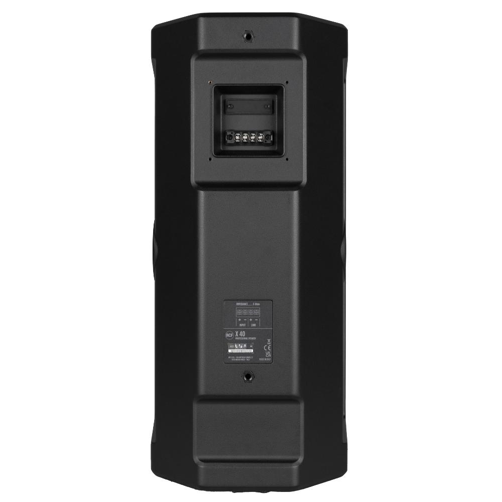 X 40 è un diffusore professionale a due vie progettato per una vasta gamma di installazioni fisse, sia indoor che outdoor, che richiedono alta qualità audio ed elevata durata nel tempo. Grazie ai trasduttori RCF all'avanguardia, con due woofer ad alta potenza da 10’’ con bobina da 3.0’’ e un driver a compressione da 1.4’’ con cupola in titanio e bobina da 4.0’’, offre un livello eccezionale di massima pressione sonora, unitamente ad un suono chiaro e bilanciato. La tromba asimmetrica con direttività 110° x 60° garantisce una copertura efficiente a diverse distanze, come ad esempio nel caso delle tribune di un circuito automobilistico. Il cabinet è realizzato in poliuretano ad alta densità, mentre la griglia in alluminio garantisce protezione da polvere e pioggia grazie a uno strato di tessuto impermeabile. È incluso un supporto per installazione verticale a muro.